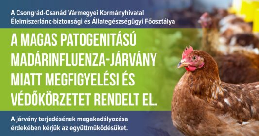 A Csongrád-Csanád Vármegyei Kormányhivatal Élelmiszerlánc-biztonsági és Állategészségügyi Főosztálya a magas patogenitású madárinfluenza-járvány miatt megfigyelési és védőkörzetet rendelt el.