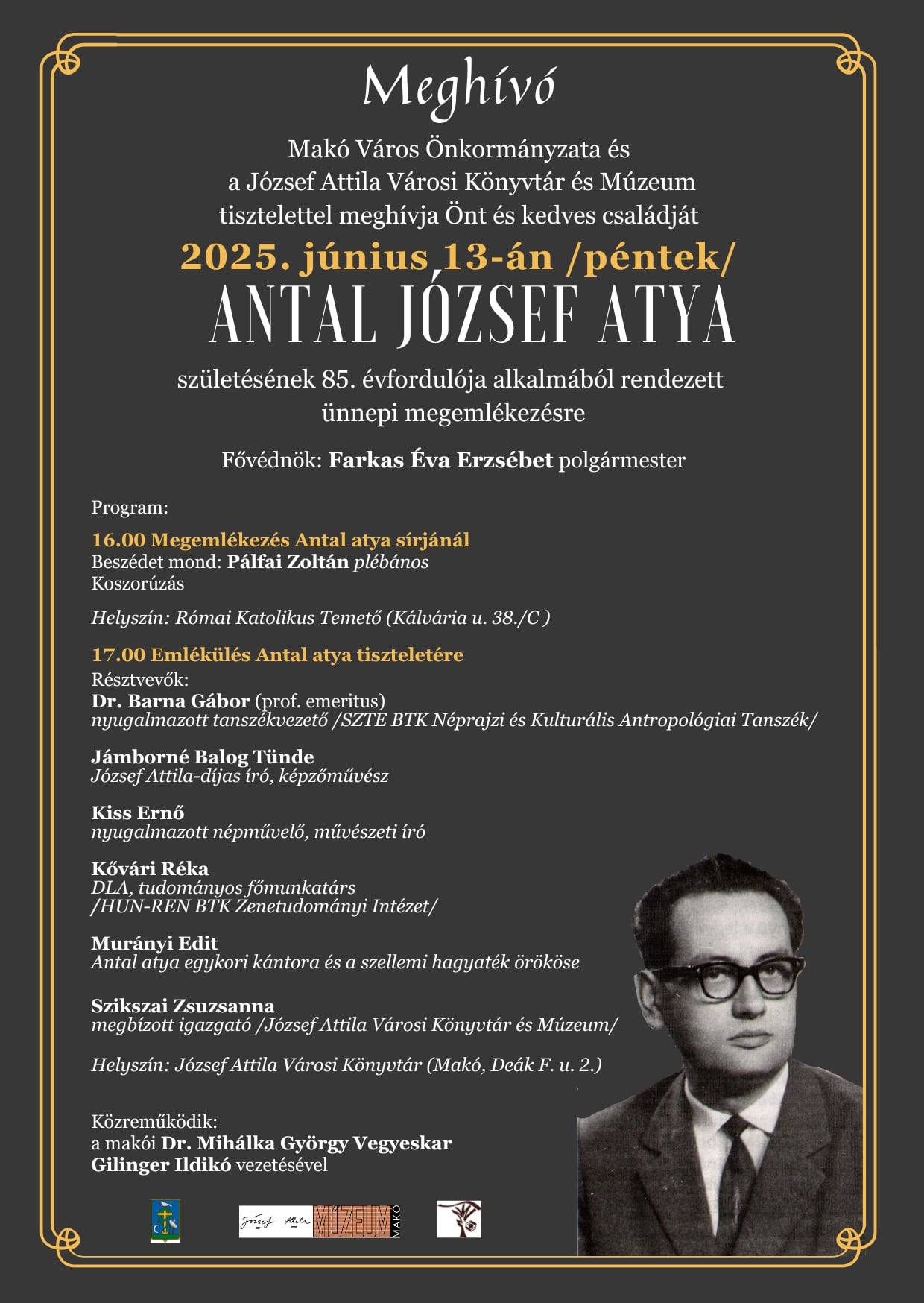 június 13. – 16:00 – 19:00 Antal József atya születésének 85 évfordulója alkalmából ünnepi megemlékezés