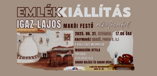 17:00 – 18:00 Emlékkiállítás Igaz Lajos makói festő alkotásaiból június 21. – 17:00 – 18:00 Emlékkiállítás Igaz Lajos makói festő alkotásaiból