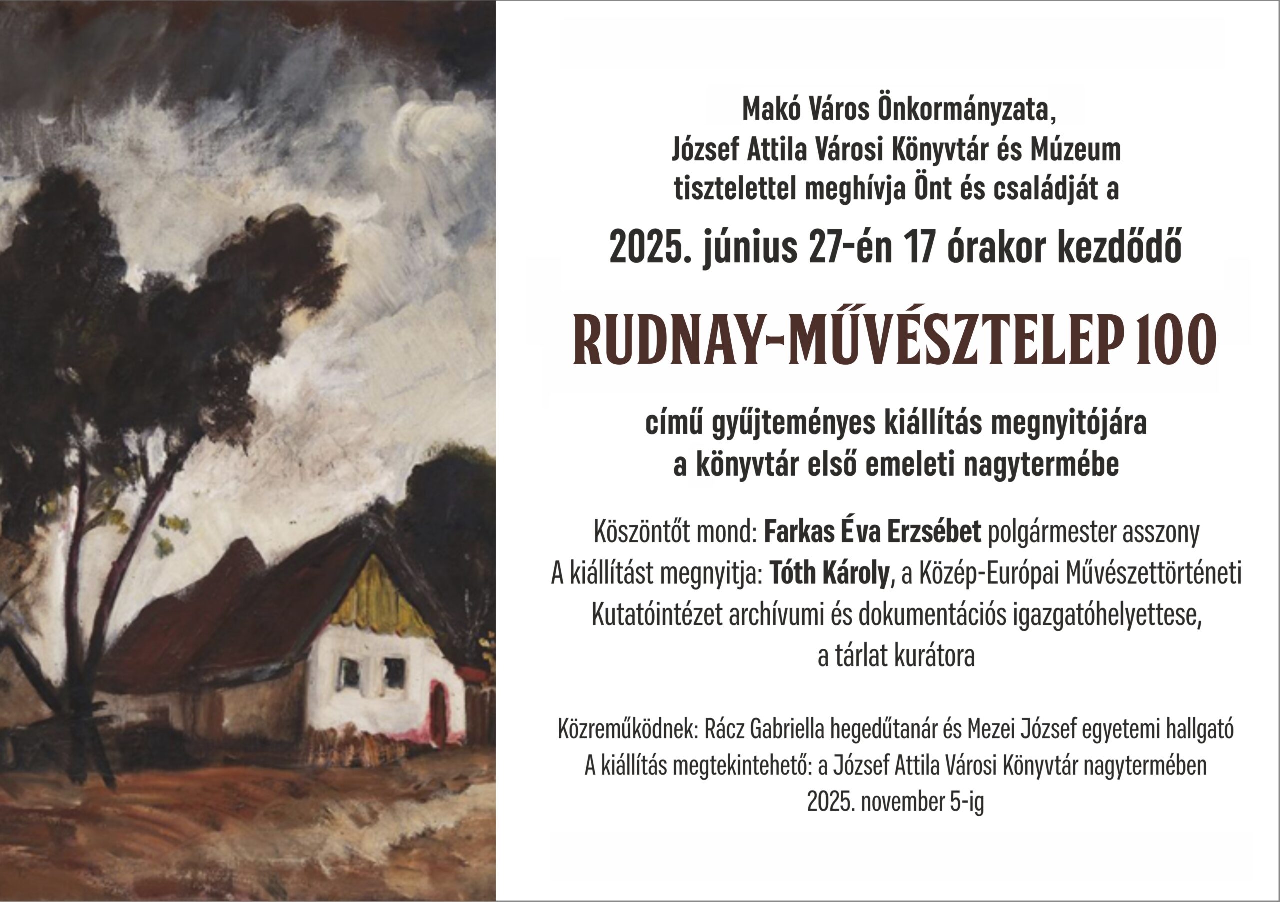 17:00 – 18:30 Rudnay-Művésztelep 100 című gyűjteményes kiállítás megnyitója június 27. – 17:00 – 18:30 Rudnay-Művésztelep 100 című gyűjteményes kiállítás megnyitója