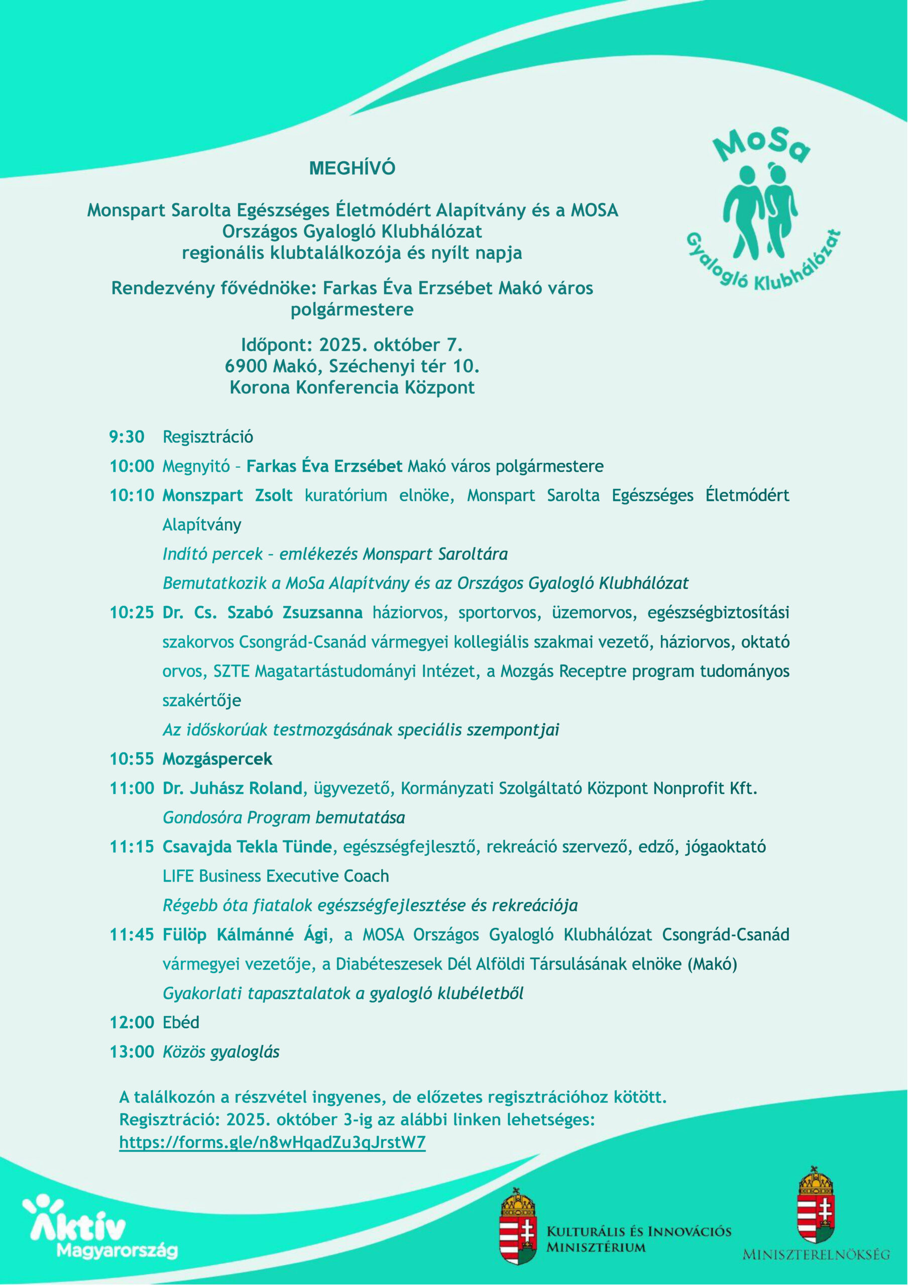 2025-10-07 Monspart Sarolta Egészséges Életmódért Alapítvány és MOSA Országos Gyalogló Klubhálózat regionális klubtalálkozója és nyílt napja Monspart Sarolta Egészséges Életmódért Alapítvány és MOSA Országos Gyalogló Klubhálózat regionális klubtalálkozója és nyílt napja október 7. Monspart Sarolta Egészséges Életmódért Alapítvány és MOSA Országos Gyalogló Klubhálózat regionális klubtalálkozója és nyílt napja