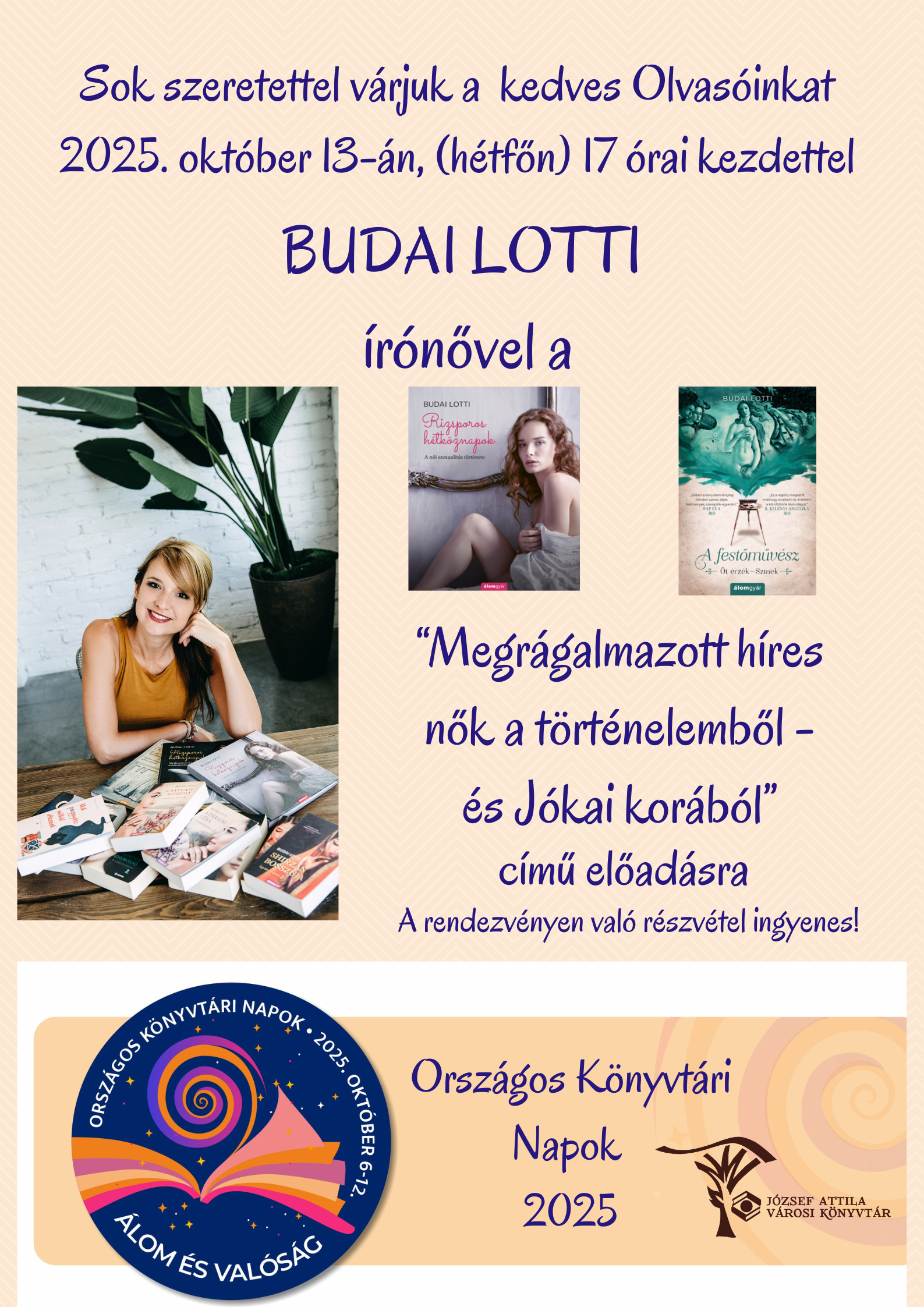 17:00 – 18:00 Megrágalmazott híres nők a történelemből – és Jókai korából – Budai Lotti előadása október 13. – 17:00 – 18:00 Megrágalmazott híres nők a történelemből – és Jókai korából – Budai Lotti előadása