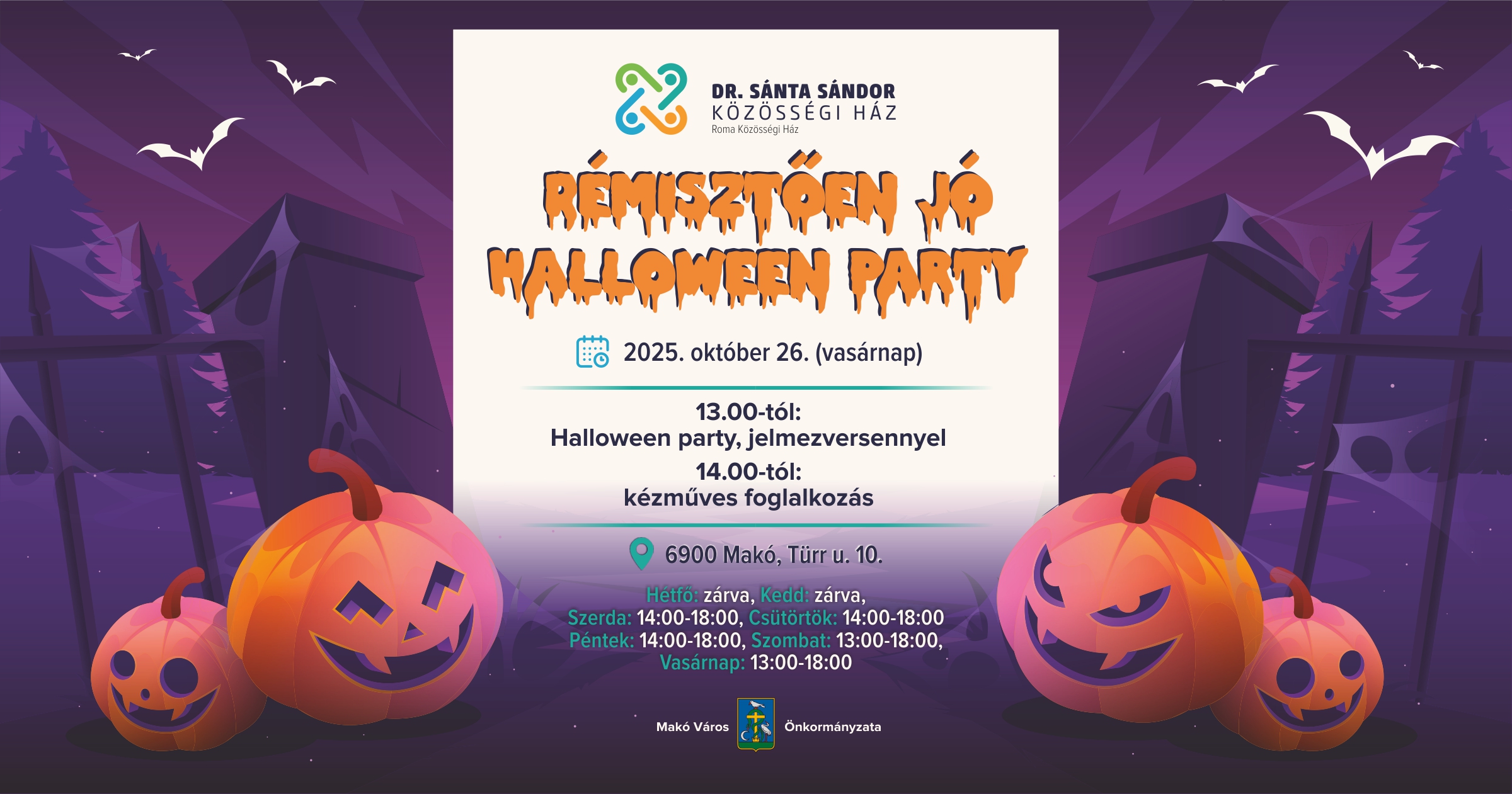 13:00 – 18:00 Rémisztően jó Halloween party a Dr. Sánta Sándor Közösségi Házban október 26. – 13:00 – 18:00 Rémisztően jó Halloween party a Dr. Sánta Sándor Közösségi Házban